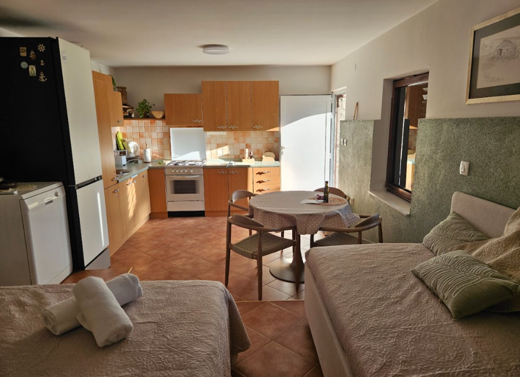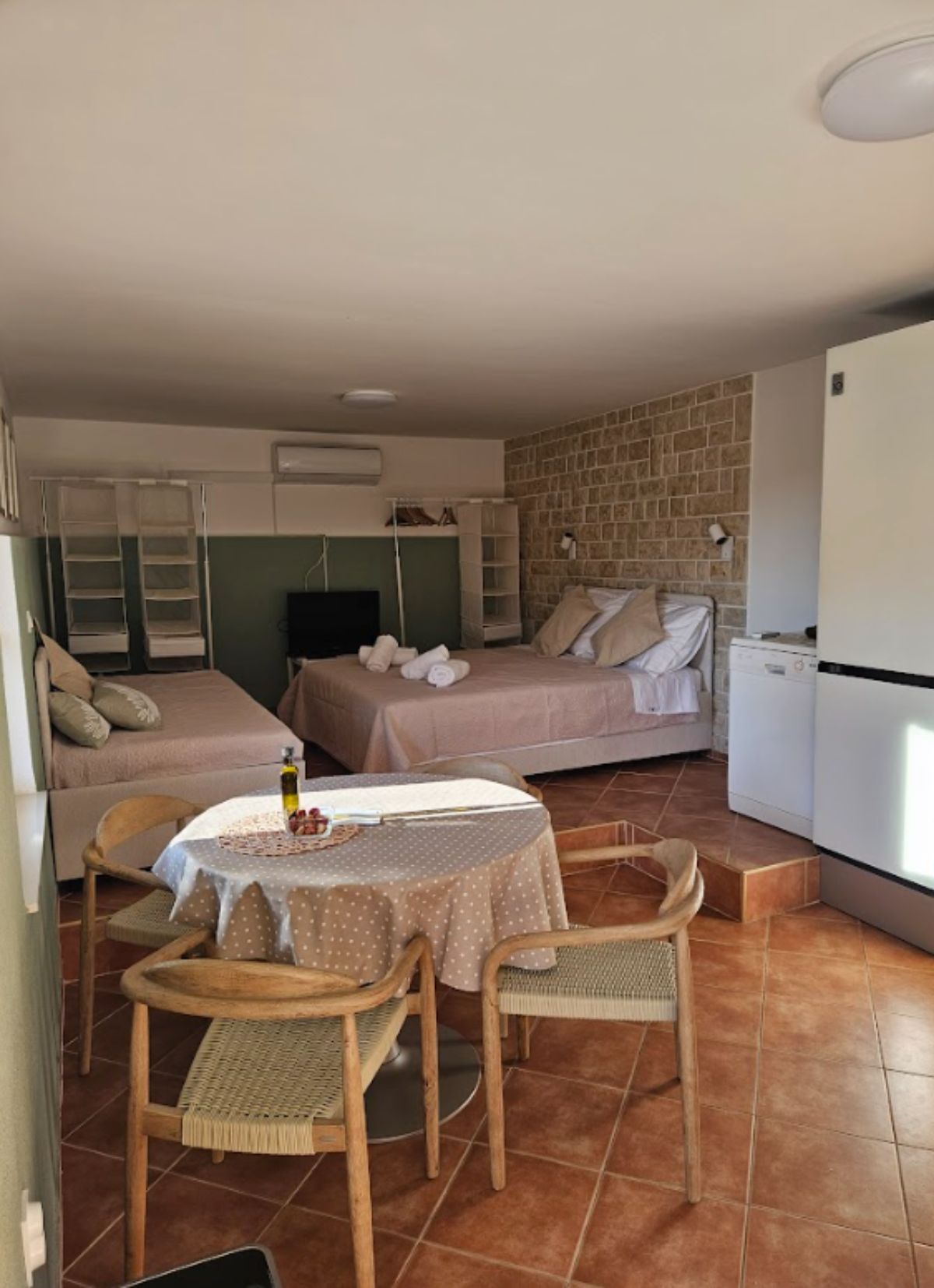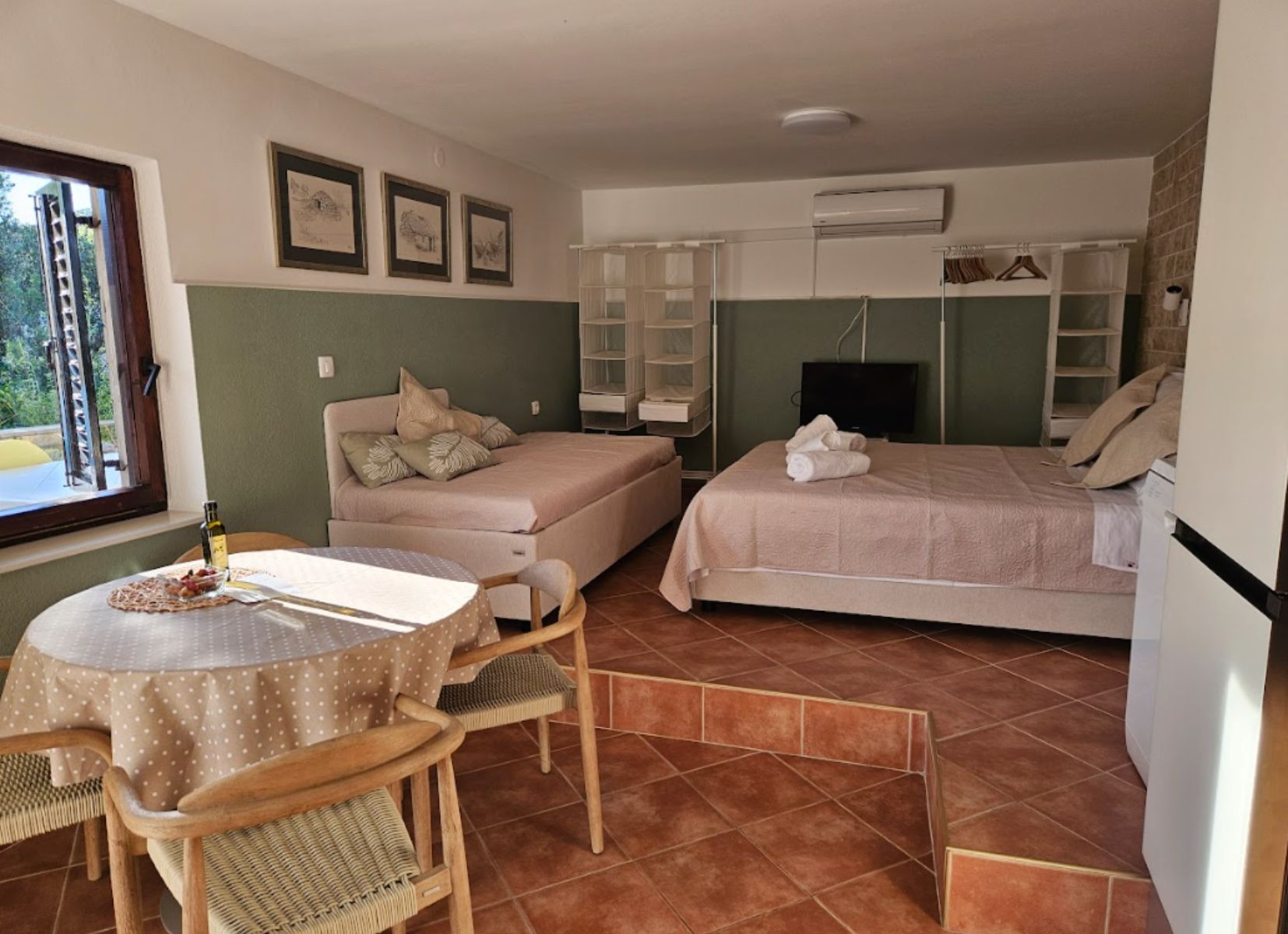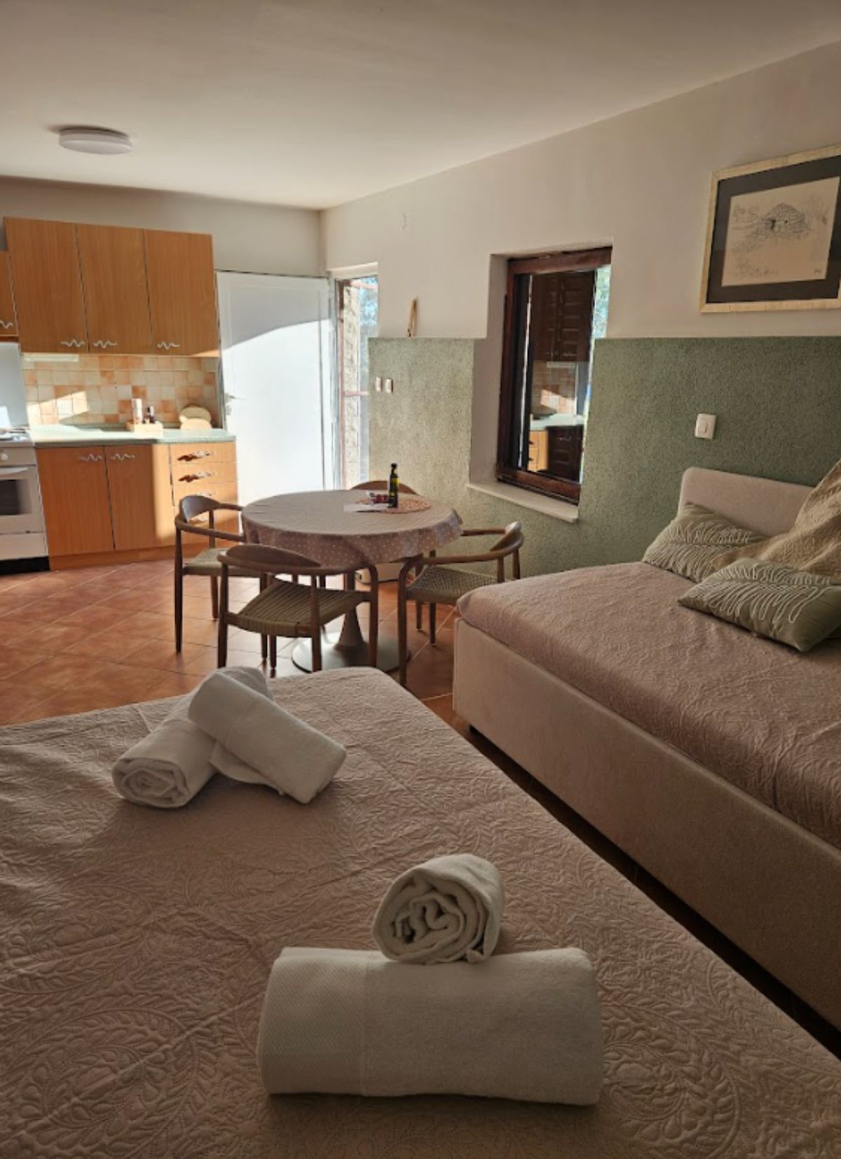 Studio Apartman Maslina se sastoji od otvorenog prostora s krevetom na razvlačenje za dvije osobe i još jednim pomoćnim krevetom. Na zahtjev na raspolaganju je i dječji krevetić.