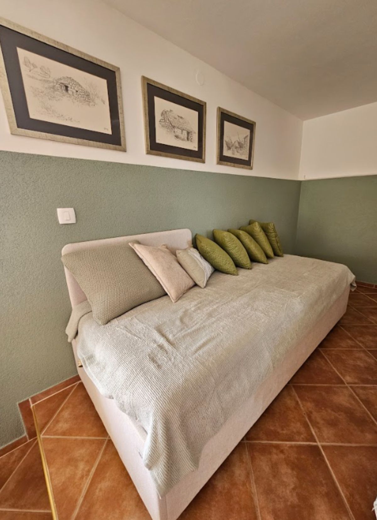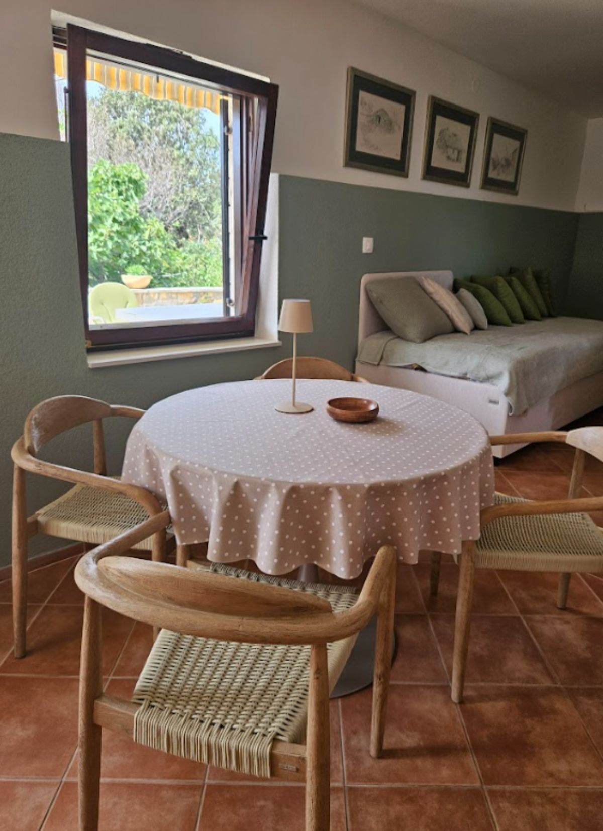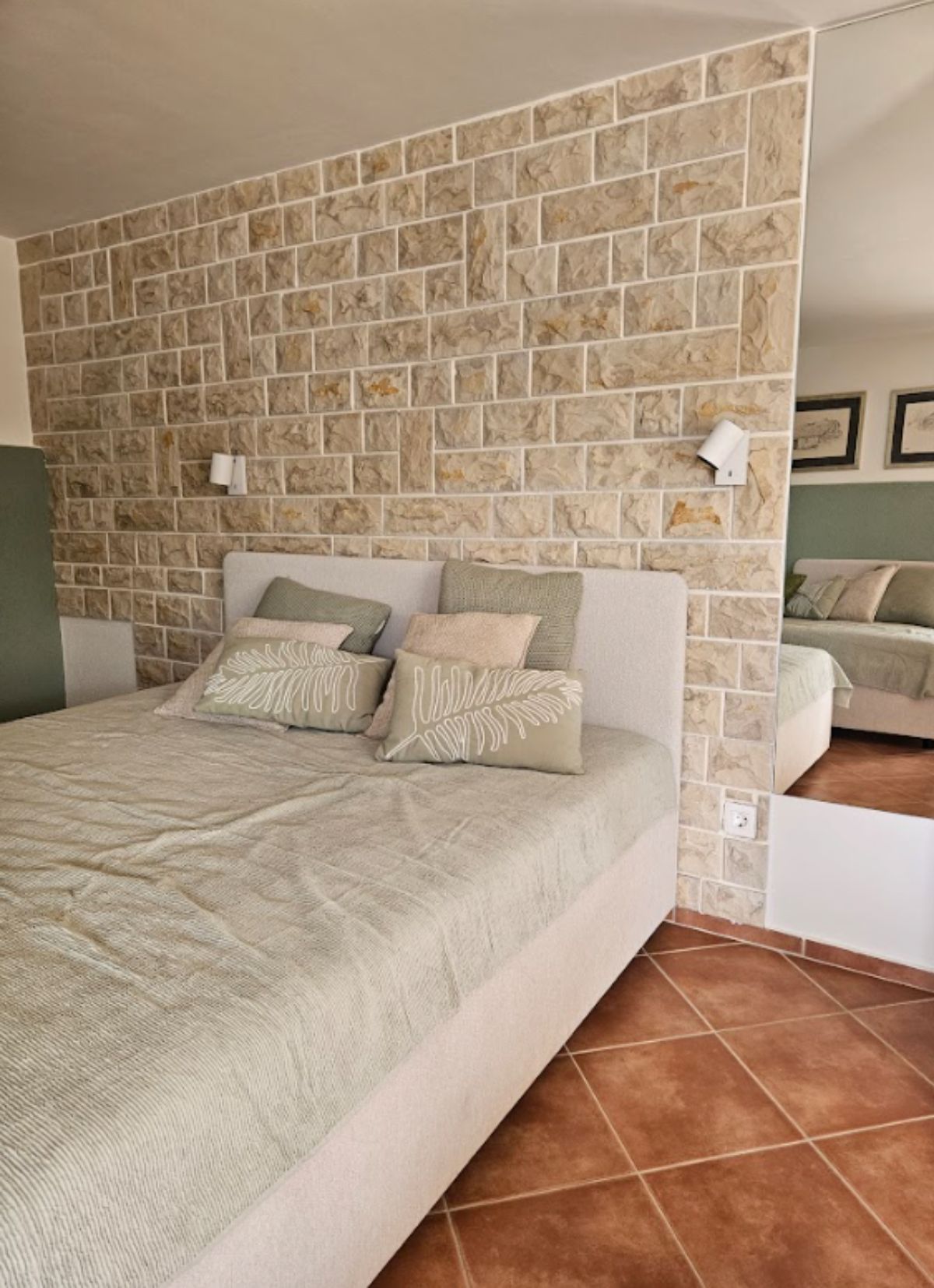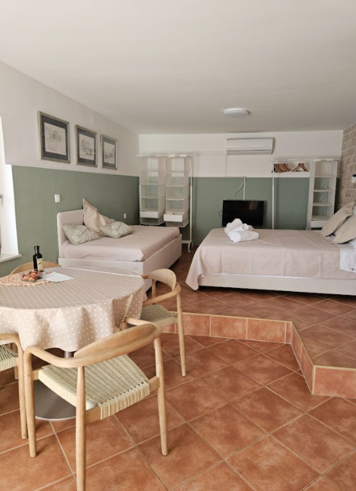 Studio Apartman Maslina se sastoji od otvorenog prostora s krevetom na razvlačenje za dvije osobe i još jednim pomoćnim krevetom. Na zahtjev na raspolaganju je i dječji krevetić.